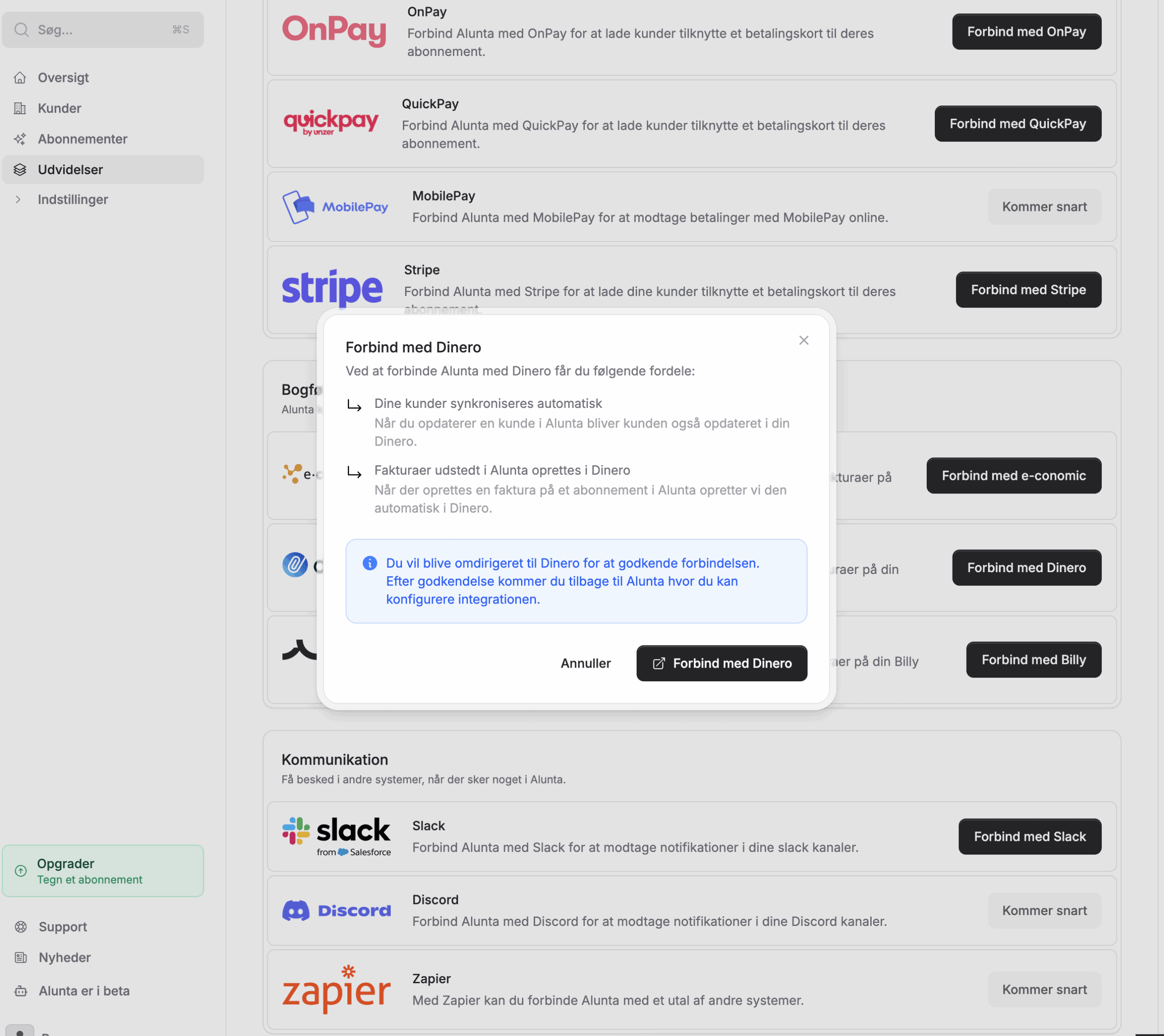 Når abonnementer fornyes, genereres fakturaer i Alunta, som derefter bogføres i Dinero.